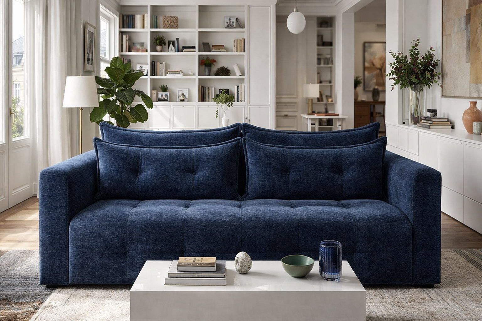 Based on even a single photo of a given upholstered furniture model (even a low-quality one) from any perspective, I can change its view to a different perspective and place it in a realistic arrangement. Additionally, I can change the color, or even the entire color scheme, of the furniture and its upholstery type.